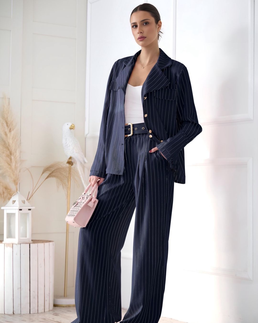 Κομψό ριγέ σετ που συνδυάζει πουκάμισο και παντελόνι σε άνετη, μοντέρνα γραμμή. Ιδανικό για chic καθημερινές εμφανίσεις αλλά και πιο προσεγμένο office look. Φοριέται μαζί για ολοκληρωμένο σύνολο ή και ξεχωριστά για περισσότερους συνδυασμούς.