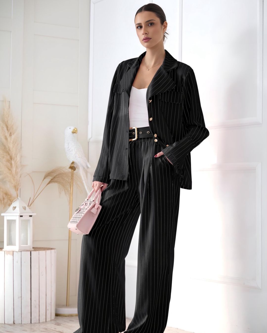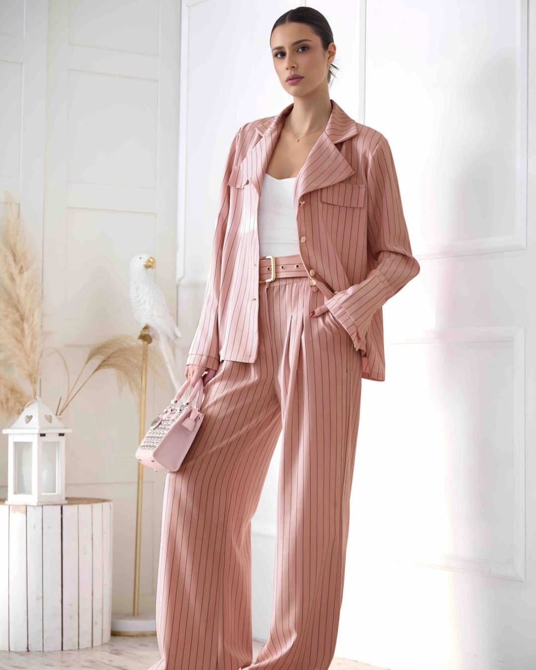 Κομψό ριγέ σετ που συνδυάζει πουκάμισο και παντελόνι σε άνετη, μοντέρνα γραμμή.